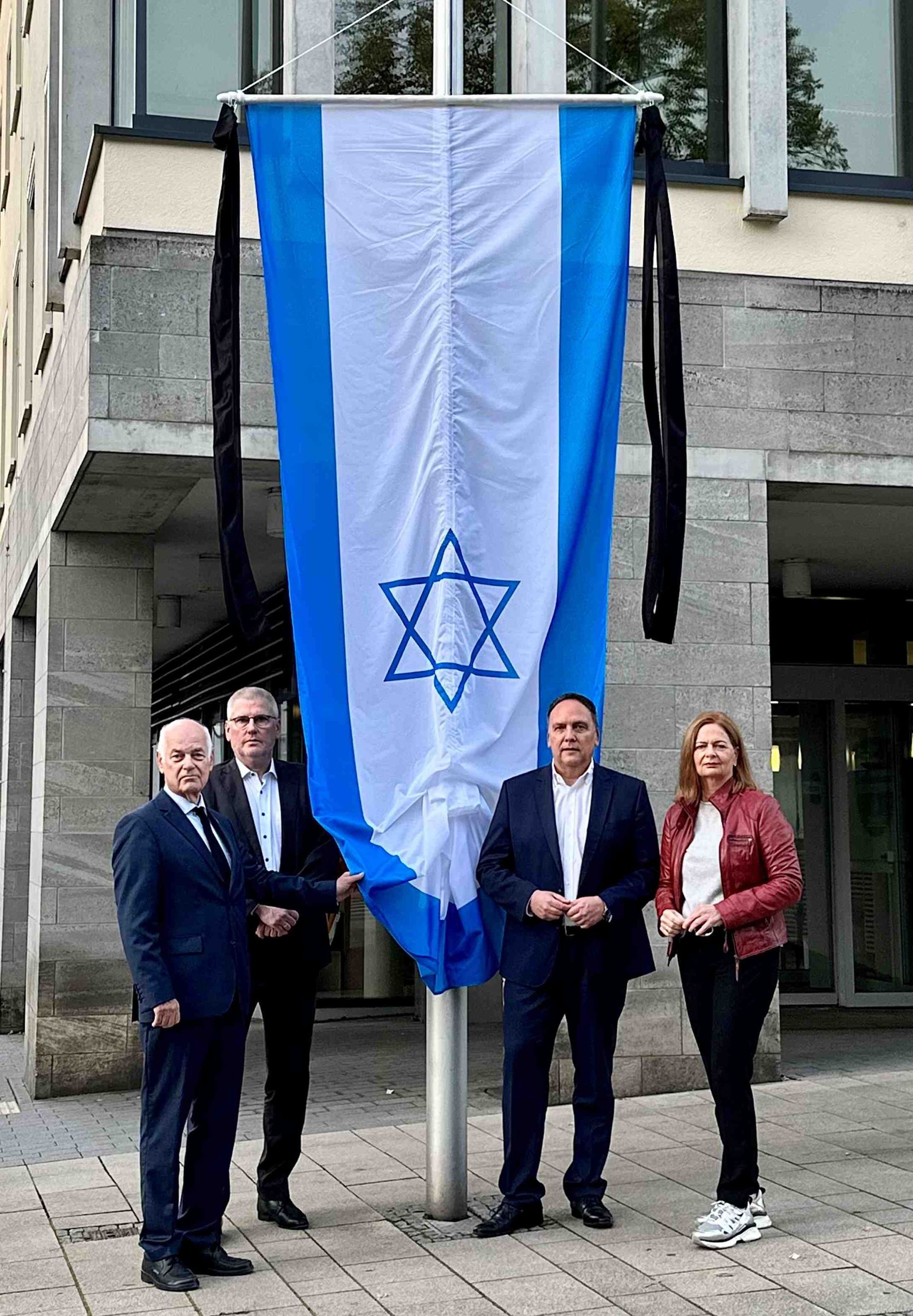 Bad Nauheim setzt ein deutliches Zeichen der Solidarität mit Israel und der jüdischen Gemeinde. Am Rathaus wurde deshalb am Dienstagmorgen gemeinsam die israelische Flagge mit Trauerflor gehisst. Die Beflaggung wird bis Freitagabend bestehen.